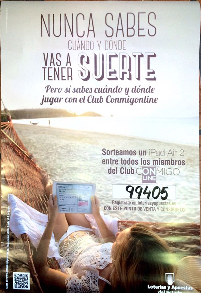 Sorteo de IPad Air 2 por ser miembro del club conmigo online de Loterias y apuestas del estado. regístrate en http://www.loteriasyapuestas.es/es/clubconmigonline/club-conmigo-online y elige punto de venta 99405. y suerte!!!