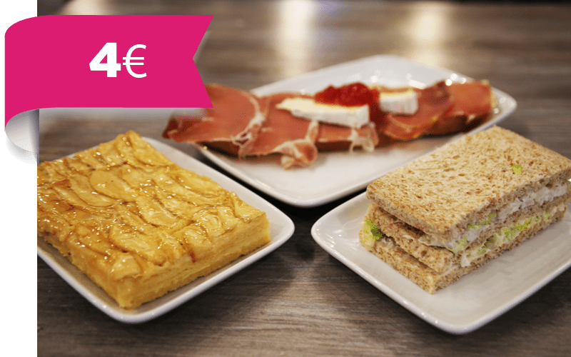Menú Tosta cena individual para llevar de 18:30 a 21:00: 1 Tosta a elegir jamon, queso, tomate… + 1 sandwich a elegir + porción tarta manzana o barra pan por 4€.
