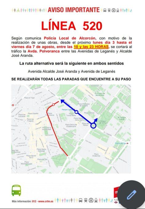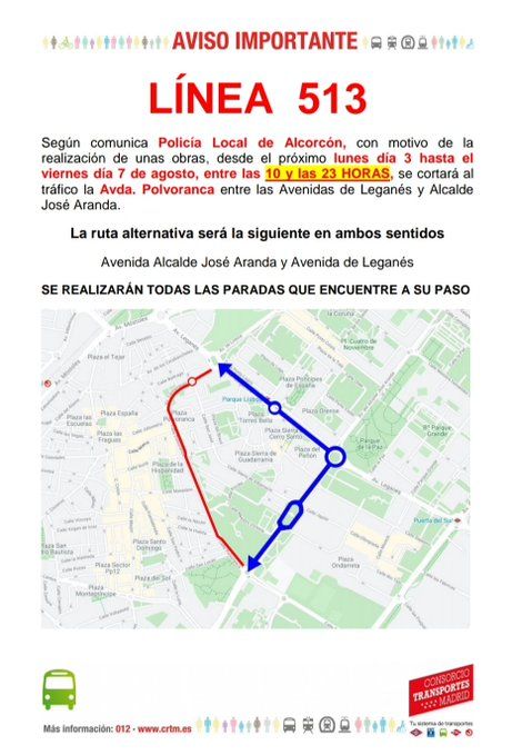 Días de verano, días de obras. Es casi una relación irremediable en toda la Comunidad de Madrid. Alcorcón no es una excepción. Desde este lunes se iniciarán obras en diferentes puntos de la ciudad. Desde primera hora de la mañana de este lunes dichos trabajos provocarán cortes de tráfico y también desvíos en líneas de autobuses de la localidad. El primer tramo cortado será en la calle Polvoranca, entre Cantarranas y la Avda. Alcalde José Aranda. El motivo será trabajos de limpieza y mantenimiento del Canal de Isabel II. El corte será entre las 10:00 de la mañana y las 23:00 horas de la noche. Estas obras del Canal provocarán desvíos en las líneas 510, 513 y 520 de Alcorcón. En las tres líneas la ruta alternativa será por la Avda. Alcalde José Aranda y Avda. de Leganés. Tanto conductores como usuarios del transporte público tienen que tener mucha atención a esta situación. Cortes de tráfico y desvíos por obras en Alcorcón.