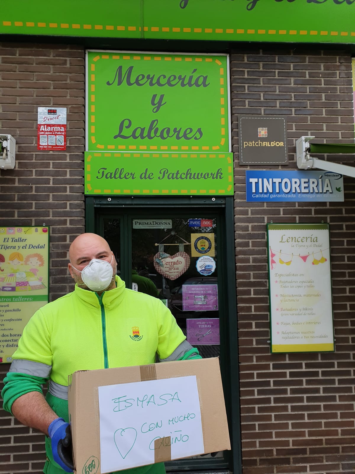 Gracias al ingente trabajo del taller de Alcorcón La Tijera y el Dedal. Donación de mascarillas para ESMASA Alcorcón y Policía Municipal de Alcorcón.