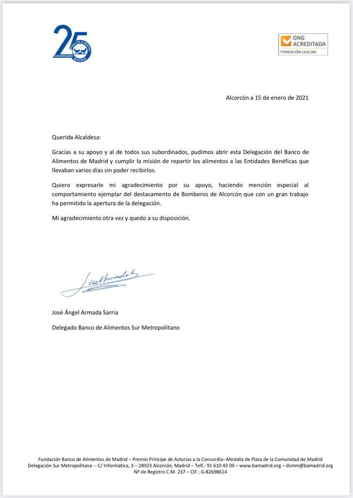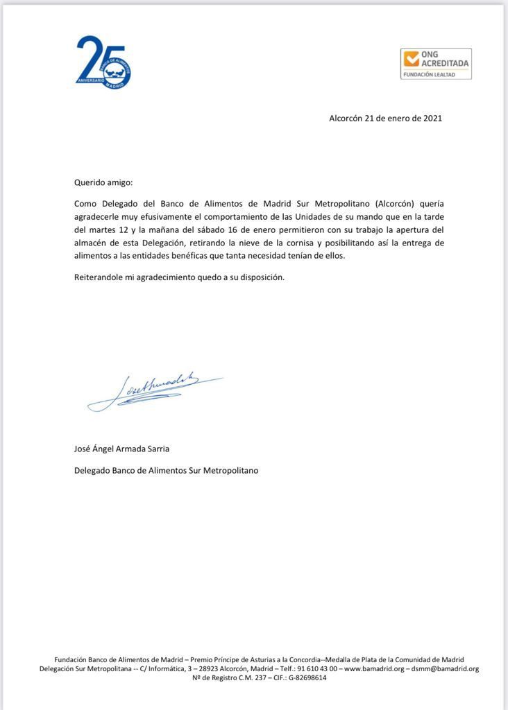 Desde el Banco de Alimentos en Alcorcón han querido enviar sendas cartas de agradecimiento al Jefe de Bomberos, a la Alcaldesa y al Primer Teniente de Alcalde “Las mandamos ayer al Ayuntamiento”. Lo cierto es que Filomena y la ola de frío ha supuesto un reto mayúsculo para la ciudad, pero, también, nos ha puesto de relieve el magnifico equipo de profesionales que tienen los servicios de seguridad y emergencia de Alcorcón. Su labor en la sede del Banco de Alimentos de Alcorcón es un ejemplo más de esa gran labor.