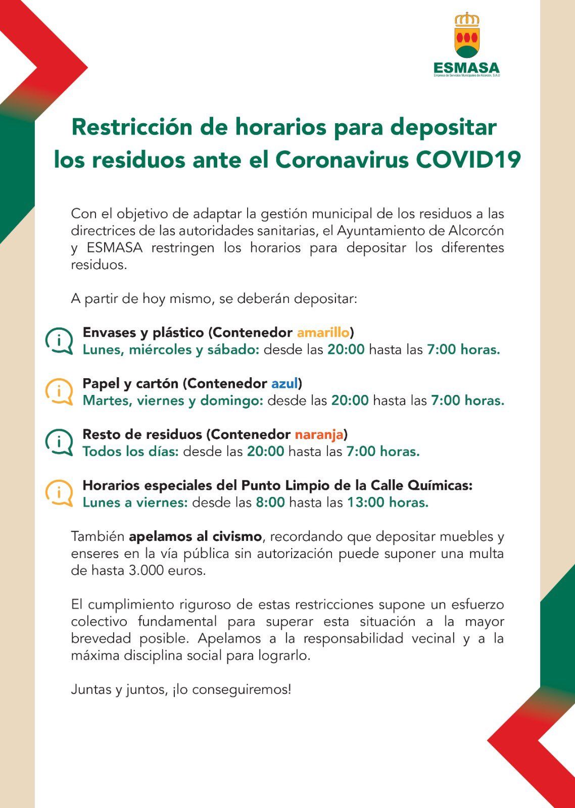 Desde las islas ecológicas a los semáforos. Los trabajadores y trabajadoras de ESMASA Alcorcón no han parado ni un solo día de limpiar y desinfectar diferentes lugares de Alcorcón. La Empresa Municipal ESMASA ha llevado a cabo medidas en el ámbito de limpieza exterior con lavaaceras, hidrolimpieadoras, desinfección de las islas ecológicas… En el ámbito interno se están realizando desinfecciones en edificios públicos y se han cambiado los horarios para depositar los residuos.