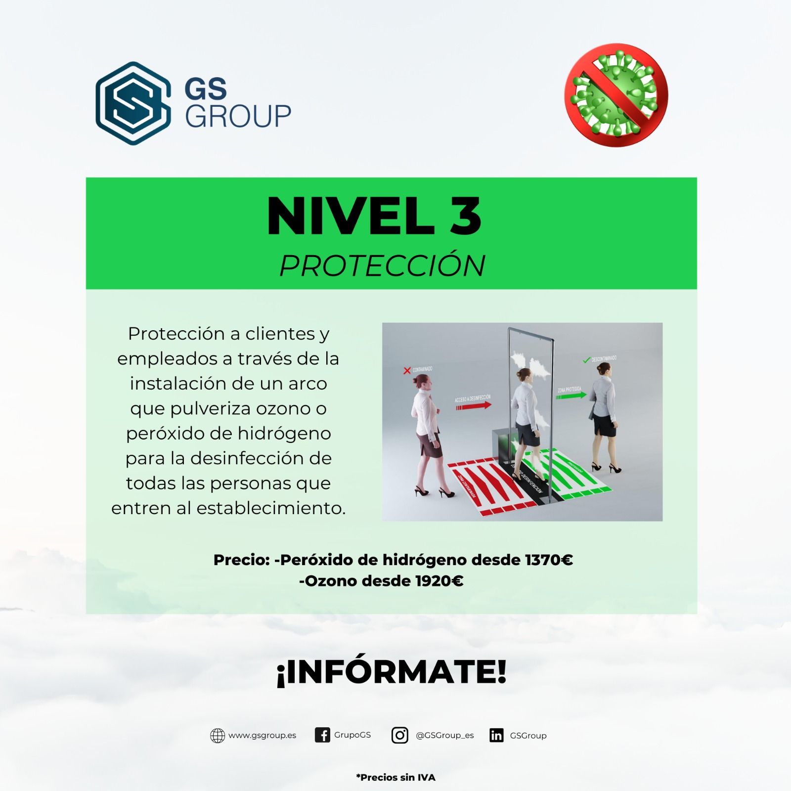 Como tercer nivel “ unos arcos que pulverizan agua ozonizada para desinfectar a todas las personas que entren en un local, comercio, edificio público… Es un producto que no daña la piel ni la ropa, el ozono es el desinfectante más eficiente y esperamos que esta semana el laboratorio lo pueda homologar y esta puede ser una solución para muchos locales”.