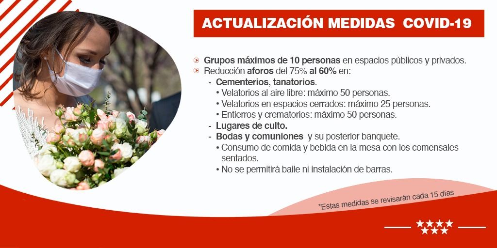 Los velatorios y bodas verán sus aforos reducidos de un 75% a un 60%. En cuanto a las bodas los banquetes, se limitan también a un aforo del 60% del lugar o establecimiento donde se desarrollen. Además, sólo se realizarán con consumo de comida y bebida en mesa con los comensales sentados, no se permitirá el baile, ni la instalación de barras. También se reducen los asistentes en los grupos que se organizan para recorrer monumentos o museos. Así, las visitas en grupo a estos últimos, salas de exposiciones y otros equipamientos culturales pasan de 25 a 10 personas. Igualmente, se limita la actividad de guía turístico a trabajar con grupos de un máximo de 10 personas.