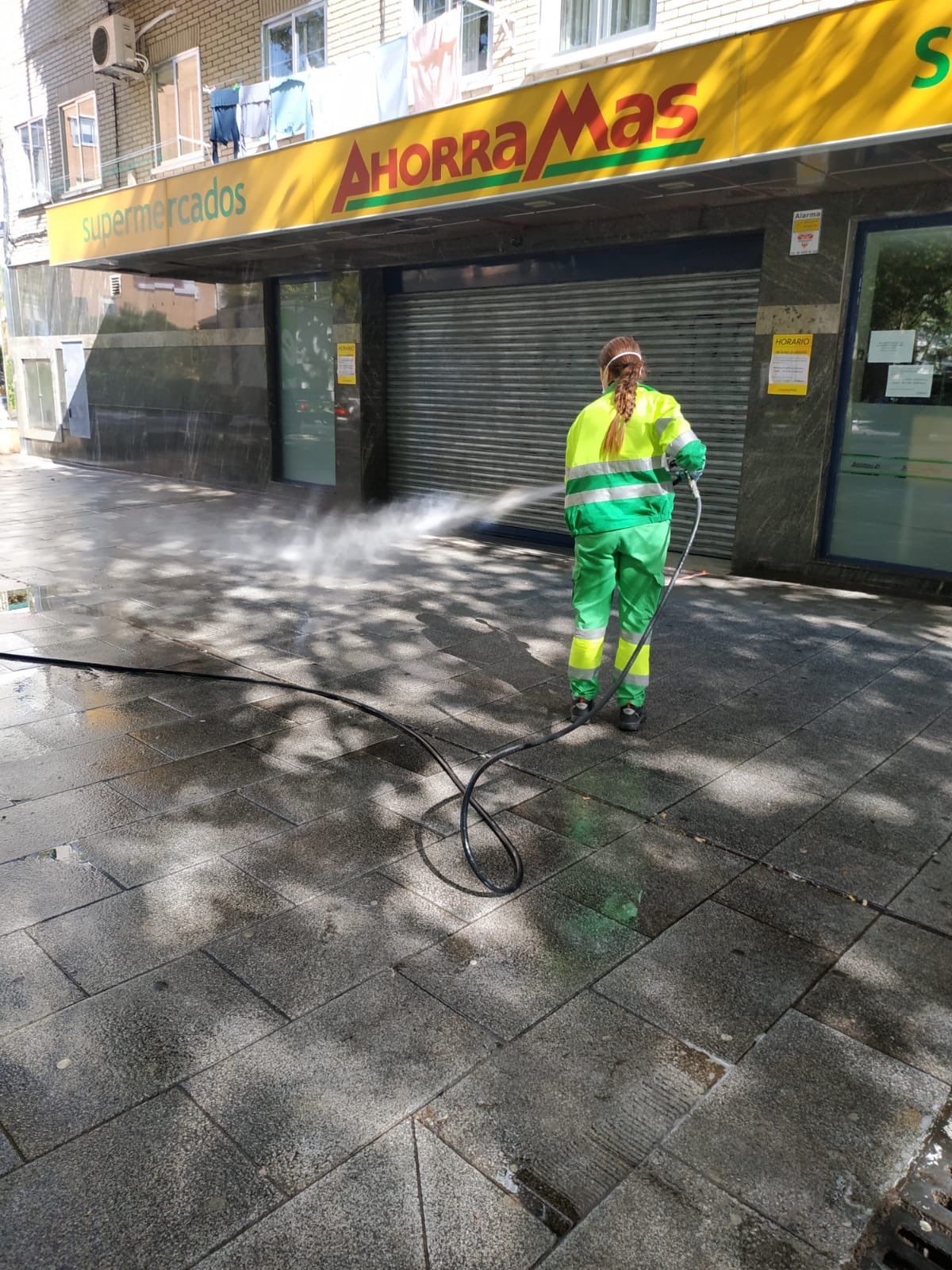 Los trabajadores de ESMASA Alcorcón están llevando a cabo la limpieza y desinfección de diferentes lugares de Alcorcón. Desde la entrada a supermercados, residencias de ancianos, mobiliario urbano, entorno de islas ecológicas, zonas de especial sensibilidad…Para que ESMASA pueda dedicar personal para desinfectar necesitamos cumplir con los horarios de deposito de residuos e introducir la basura dentro del cubo. Los trabajadores de ESMASA nos lo explicaban “Las islas y contenedores se tienen que desinfectar cuando estén vacíos. Estos horarios y días de depósito están diseñados y pensados para organizar y facilitar el vaciado y posterior desinfección”